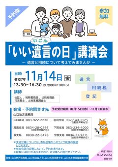 「いい遺言の日」を記念して山口地方法務局が講演会を実施します。当会の土地家屋調査士も「相続と表示登記について」と題した講演をいたします。