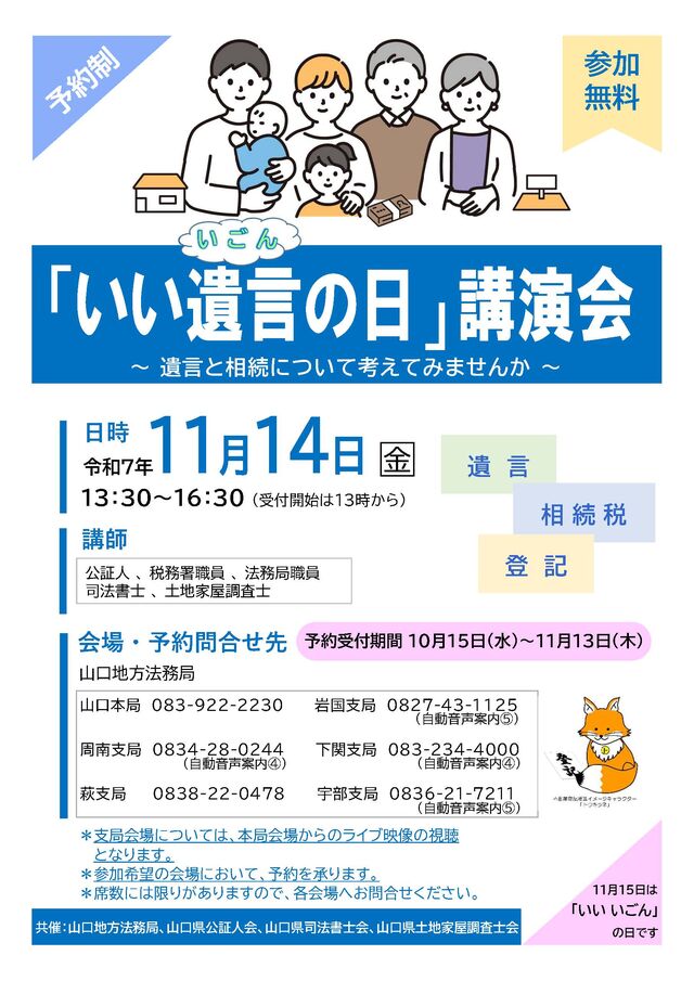 「いい遺言の日」を記念して山口地方法務局が講演会を実施します。当会の土地家屋調査士も「相続と表示登記について」と題した講演をいたします。ぜひこの機会に遺言や相続税、登記についてご理解を深めて下さい。(予約制)